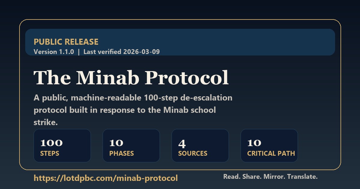 The Minab Protocol is live: a public, machine-readable 100-step de-escalation protocol built after the Minab school strike. Read, share, translate, embed: https://lotdpbc.com/minab-protocolThe release pack now includes multilingual short-form copy for rapid redistribution.